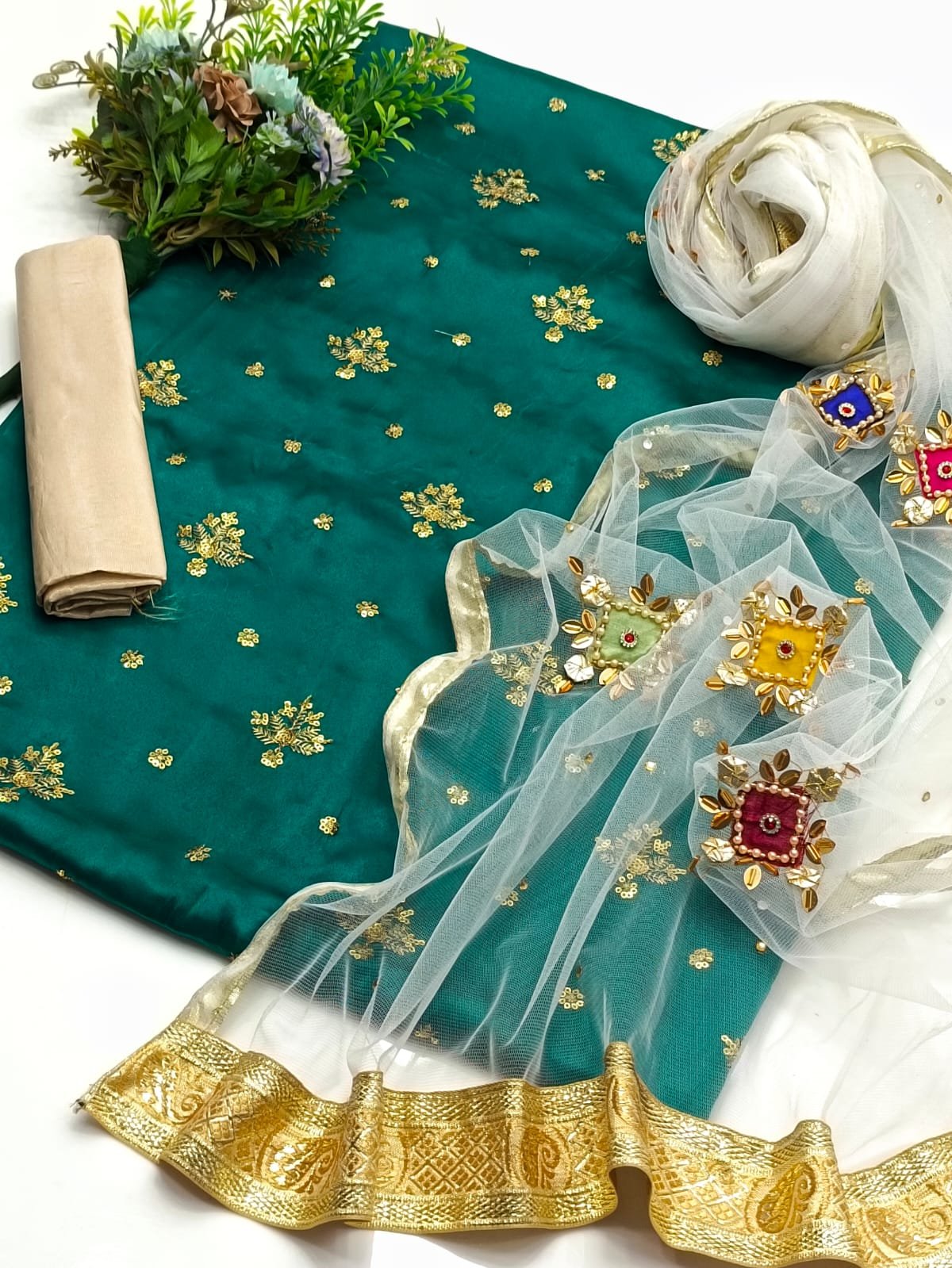 AmorZaib Partywear 3pc Fancy Dress – Shamoz Silk & Net Dupatta – Dark Green