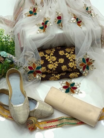 AmorZaib Luxurious 4PC Embroidered Dress with Free Khussa – Brown