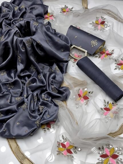 AmorZaib Fancy 4-Piece Embroidered Silk Ensemble – Grey