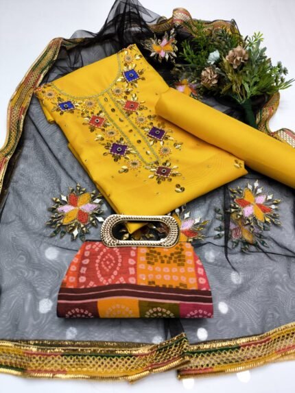 AmorZaib Fancy 4-Piece Embroidered Silk Ensemble – Yellow